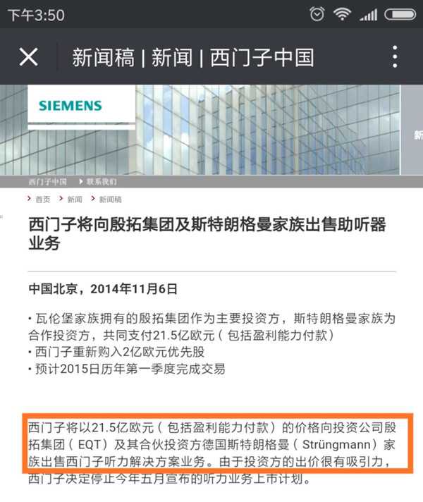 2014年11月16日西门子决定出售助听器业务