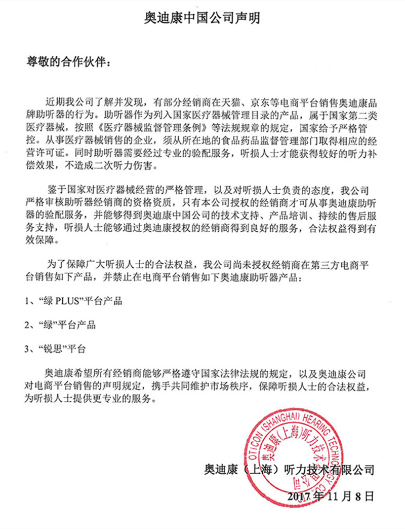 关于电商平台销售奥迪康助听器声明