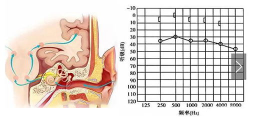 指声音在传导径路上,由于任何结构与功能障碍导致进入内耳的声能减弱所造成的听力下降。但耳蜗之后声音传导正常,即骨导听力正常,听力曲线图上表现为:气导听阈提高(大于25dB),骨导听阈正常(通常小于15dB),气骨导差值大于10dB。反映在听力图上为气导曲线在下方,骨导曲线在上方,气、骨导间距大于10分贝以上,这就是传导性耳损的特征。