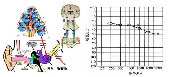 指由于螺旋器毛细胞、听神经、听觉传导径路或各级神经元受损害,致声音的感受与神经冲动传递障碍以及皮层功能的缺如,但耳蜗之前的传导是正常的。听力图上表现为:气导、骨导阈值均提高(大于25dB),两条曲线重合,即多数频率点上无气骨导差值(小于10dB)。