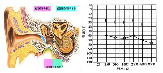 指传音与感音系统同时受累(即上述两种病变同时发生)。听力图上表现为:气导与骨导听力曲线皆有下降,而且气导听力曲线降低更明显,气导阈值提高(大于25dB),骨导阈值提高(大于25dB)。气骨导差值大于10dB。