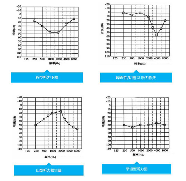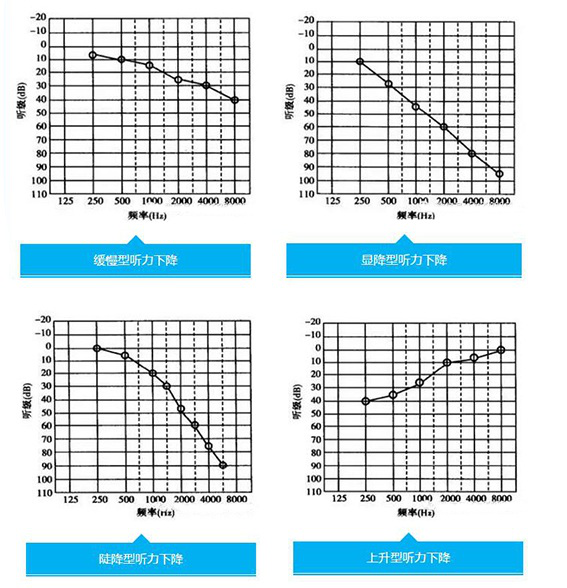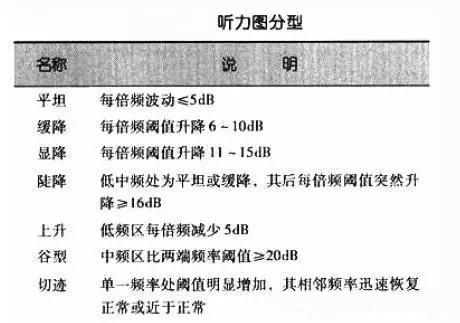 根据各频率纯音听阈损失情况,听力图可分为平坦型、缓降型、显降型、陡降型、上升型、槽型或谷型、切迹型及山型。
