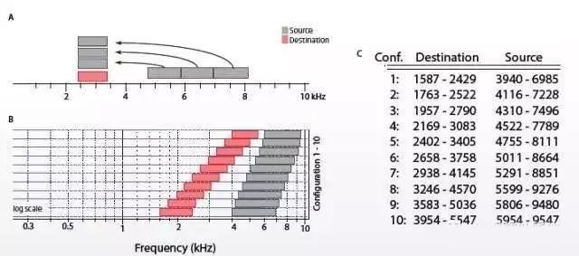 移频新概念复制转移了高频信息。Genie中有10个设置可用,是基于患者的听力损失设置的。灰色是源区域,红色是目标区域,图中最上面的设置是最弱的配置,最下面的设置是最强的配置。
