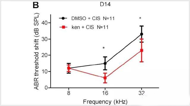 在随后的第7和第14天记录ABR阈值,结果显示kenpaullone分子对小鼠的噪声性听力损失具有保护作用(如下图)。