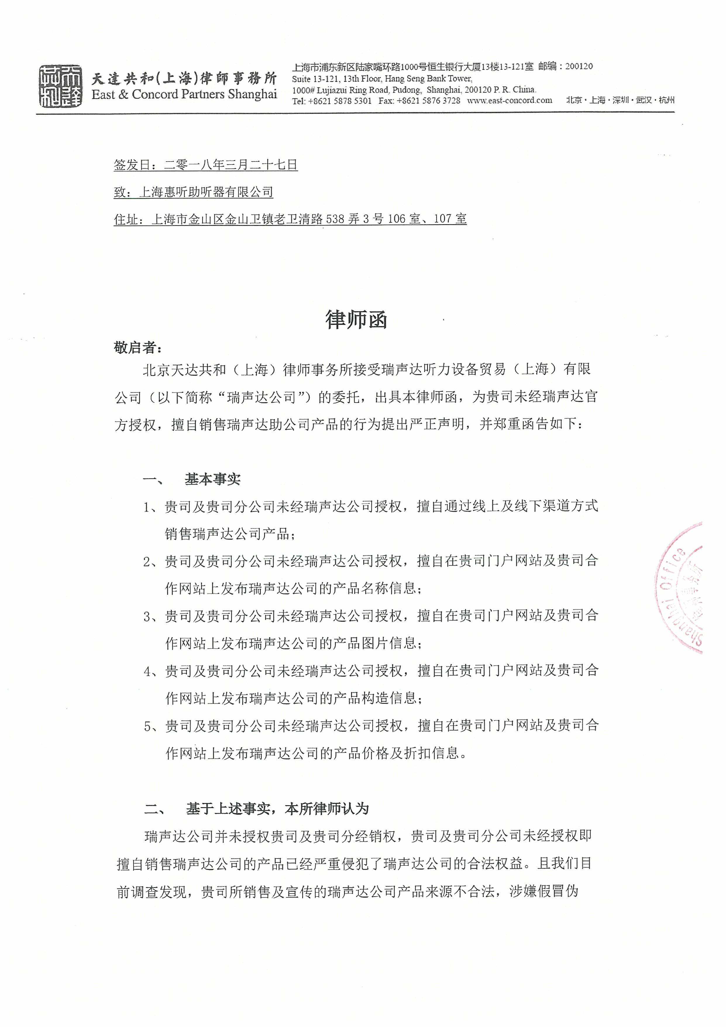 继奥迪康助听器、峰力助听器、西门子助听器及西嘉助听器各个助听器厂商向惠耳助听器公司、惠听助听器公司发律师函后,2018年3月27日,瑞声达助听器公司也委托律师事务所向未经瑞声达官方授权,擅自销售瑞声达助听器的惠听助听器有限公司发律师函,函告中指出:惠听助听器公司未经瑞声达助听器公司的授权,擅自通过线上及线下渠道销售瑞声达公司产品,对旗下产品构造及价格、折扣信息无权发布。