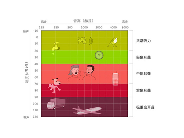 响度的单位是分贝(decibels)。0分贝并不代表没有 "声音"。只是,它非常的弱。正常的谈话大概是65分贝左右, 而120分贝的声音则非常非常响亮——约等同于25米远处的飞机起飞时的响度。听力图一侧的数字即是听力级分贝数。
