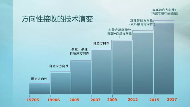 郗教授对助听器方向性的技术的发展史进行了梳理。技术领导者瑞声达持续引领着助听器方向性技术的发展,近半世纪里由关注指定方向的声音往自然方向性发展。