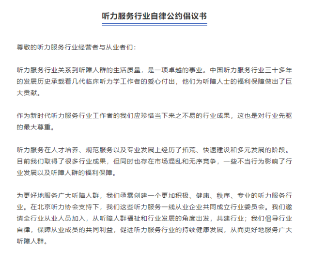 为了行业成员的共同利益、保障听力服务行业的持续健康发展,更好地服务听障人群,听力行业服务委员会成员发起成立行业自律公约,希望发挥正向的力量,从行业的小事出发,形成燎原之势。
