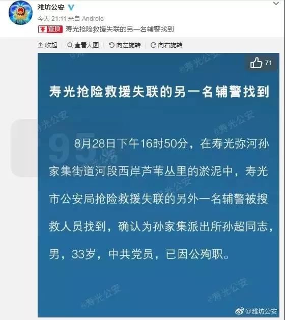 8月28日下午16时,在弥河孙家集街道河段西岸发现另一名辅警,确认为孙家集派出所孙超同志(男,33岁,因公殉职)。