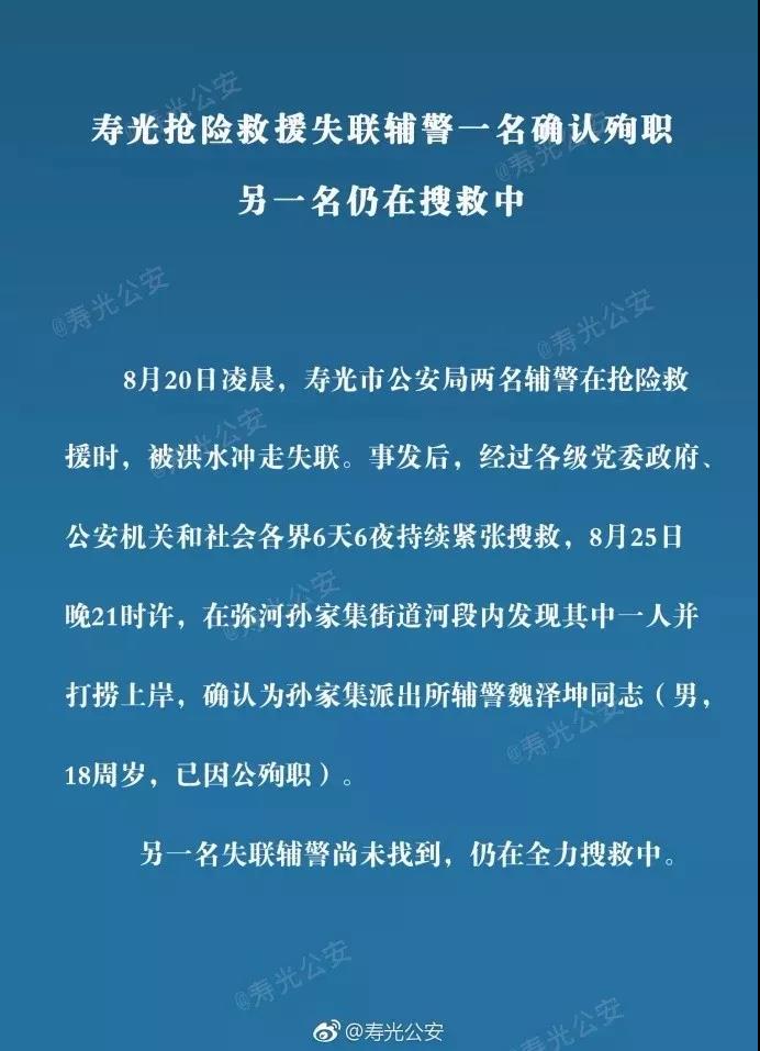 8月25日晚21时许,在弥河孙家集街道河段内发现一人,确认为孙家集派出所辅警魏泽坤同志(男,18周岁,因公殉职)。