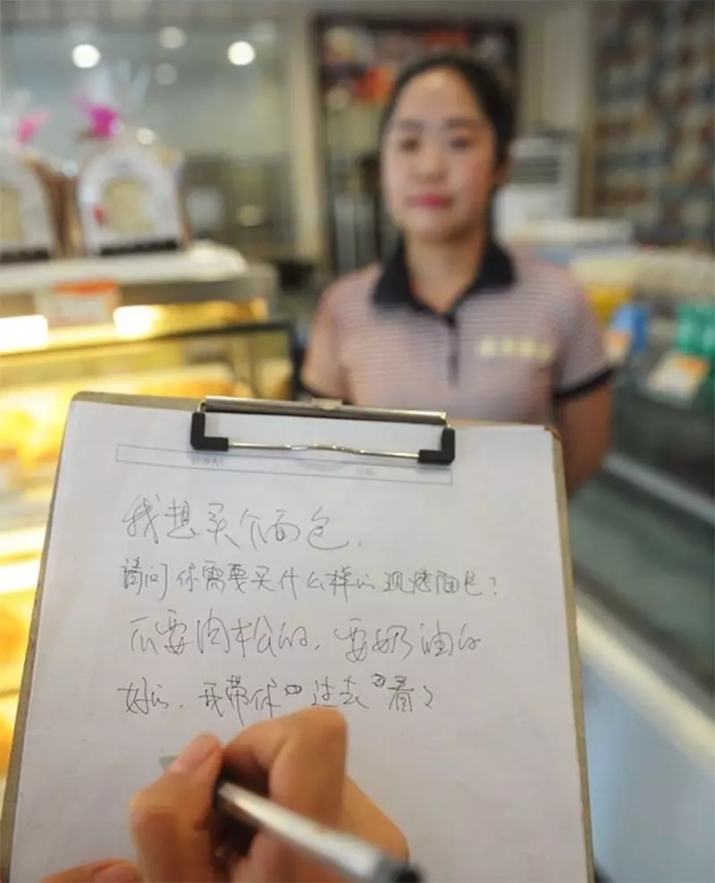 为了化解与顾客交流的尴尬,锁轶想了很多的解决办法。“只要客人一进门,我们就端盘迎在身后,主动提醒指示上面贴有商品信息的标签,或者准备好纸笔、平板进行交流。”