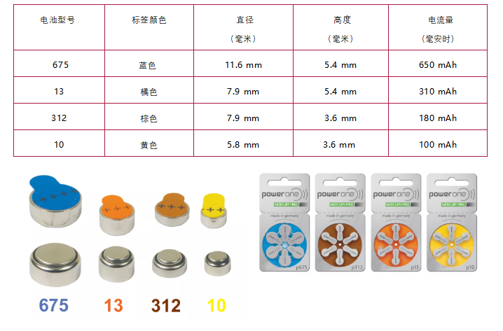 助听器电池有四种型号:10,13,312和675。助听器电池由各种制造商生产并具有各种尺寸。耳背式(BTE)助听器通常需要13和312电池,而耳内(ITE)助听器往往需要较小312和10号。