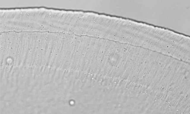 该图像通过光学显微镜拍摄,显示了覆盖膜的横截面,这是一种凝胶状结构,位于内耳上的微小毛发顶部。
