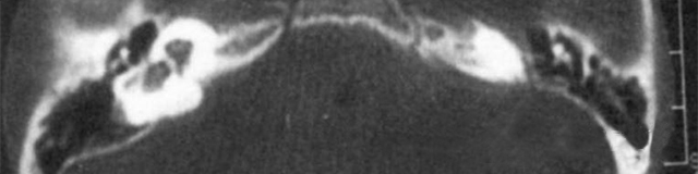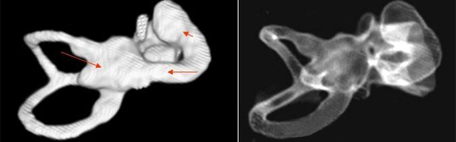 双侧内耳畸形:左侧无内耳迷路及内耳道机构,为米歇尔畸形;右侧空耳蜗及前庭扩大,为先天性耳蜗畸形