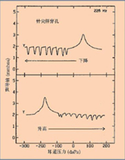 上图为压力从正到负变化,峰值出现在正向。下图为压力从负到正变化,峰值出现在负向。两鼓室图中锯齿状的尾部表示在鼓膜针尖样穿孔的边缘,压力出现波动。