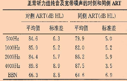 声反射阈(ART)指的是能引起声反射的最小刺激声强度,也就是指能引起镫骨肌收缩的最小刺激声强度。临床上通常采用500、1000、2000Hz的纯音作为刺激声,有时也用宽带噪声。通过大量的研究,声反射阈的正常值范围已经建立:当刺激信号为纯音时,正常值为85~100dBSPL,比宽带噪声大约低20dB。