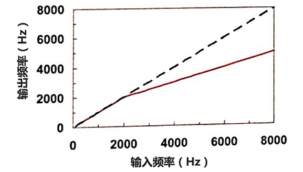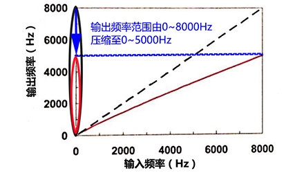 图中所示移频为线性频率压缩,每个输出频率约等于相应输入频率的1/2,例如频率由2000Hz移至1000Hz。