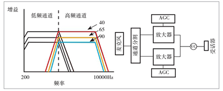 能够在不同的频率范围独立调节增益和压缩的助听器被称为多通道助听器,它将输入信号按照频率的不同分配到相应的频率区域,分 流后的信号各自经过对应的放大通道,如图所示。多通道助听器的最大优点是能够提高临床验配的灵活度,独立调节增益能够满足非平 坦型听力受损人士对各频率不同增益的需求,这意味着不同的听力损失只需一种助听器线路就可以了。