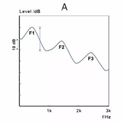 图A显示了一个未经过助听的元音频谱,其三个共振峰频率分别被确定为F1、F2和F3。F1峰与F2谷的差距是频率对比度。图2A也可以被认为是单通道助听器在助听后的频谱,因为所有共振峰获得的增益是相同的。