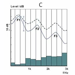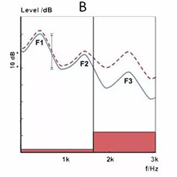 图B显示的是使用双通道助听器助听后的共振峰。红色柱状图显示的是低频和高频通道的增益量。因为高频比低频的听力损失更严重,所以高频段比低频段获得更多的增益。然而此时的频率对比度减小,尤其是F2和F3之间。