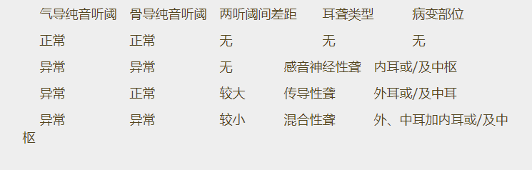 正常情况下我们是通过两条途径来感受声音信号的——气导途径和骨导途径。前者我们非常熟悉,从外耳到中耳到内耳到听中枢;后者我们或许不太注意:从颅骨直接到内耳到听中枢。相应地,纯音听力检查也有两种声音剌激方式,气导输入和骨导输入。前者我们天天使用,而后者则很少被我们使用。事实上,两阈值曲线的异同正是我们判断听损病变部位的基础(见下表)。了解患者病变部位对于获得他们的信任以及确定助听器电声性能都有非同寻常的意义。因此,有条件的时候还是应当重视骨导听阈测试。