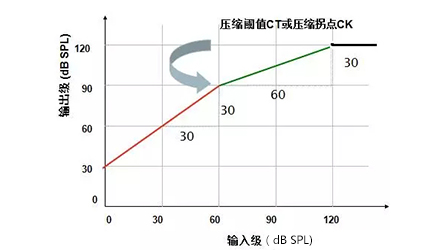 1、压缩拐点(CK):线性放大与压缩放大的临界输入级,此处为60 dB SPL,即输入声强度在60 dB SPL以下时为线性放大,超过60 dB SPL为压缩放大。①红线的输入级范围为0~60 dB,这段的声音为线性放大,随意找一个输入级,用它对应的输出级减去输入级,得出线性放大的增益为30 dB;②当输入级大于60 dB时,绿色曲线为压缩放大,输出与对应输入的差值不再是30 dB,而是随着输入级增加,增益逐渐减小;③当输出达到最大输出限制时,输出不再增大,保持在最大输出限制位置。