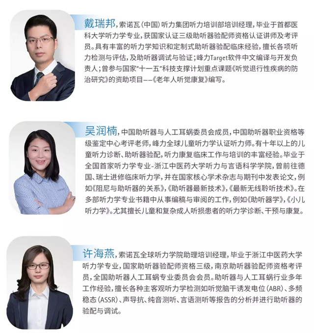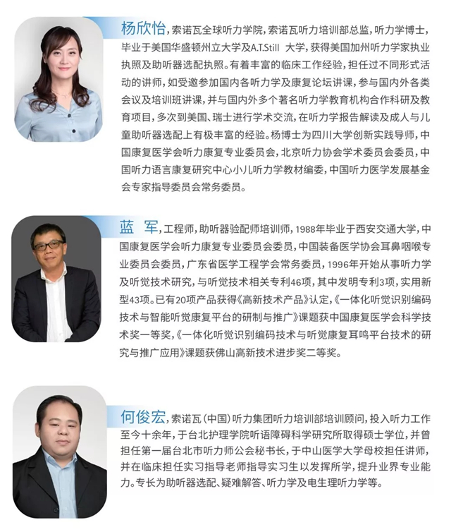 工作坊精英汇聚,群贤毕至,有索诺瓦亚太听力学总监,有听力康复专业委员会的副主任教授,有索诺瓦中国培训总监,还有国内耳鸣界赫赫有名的各位老师,他们将带来一场以“耳鸣”为主题的试听盛宴!