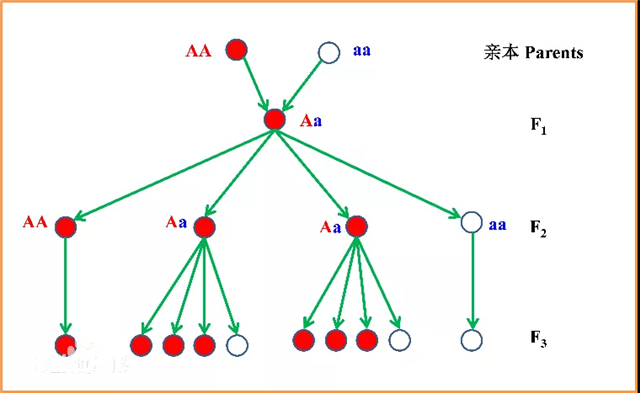 常染色体可以这样理解,比如说我有一双手,这双手分正反面。比如说AA,在这里有一个图,AA就代表手的背面,aa就代表手的掌心面,要把其中的一个和另外一个搭配,传给下一代。你只传一只手给你的下面一个人,一个AA的人和一个aa的人传到下面一代会是什么样子呢?那就是他分出来一个A和另外一个A,然后aa会分出来一个a和另一个a,然后A和a结合,那他的子代肯定是Aa,A和a也在不断和自己自交,自交之后又会产生AA,Aa,Aa,aa。这就是一个经典的常染色体隐性的遗传,符合孟德尔定律。孟德尔定律也是遗传学中一个相当重要的定律,它是由奥地利的遗传学家格里哥孟德尔在1865年发表,并催生了遗传学的著名定律,它揭示了遗传学的两个重要的规律,一个是分离定律,还有个是自由组合定律。分离就是把你的两只手分开,自由组合就是把你的手,手心或者手背传给下一代人。
