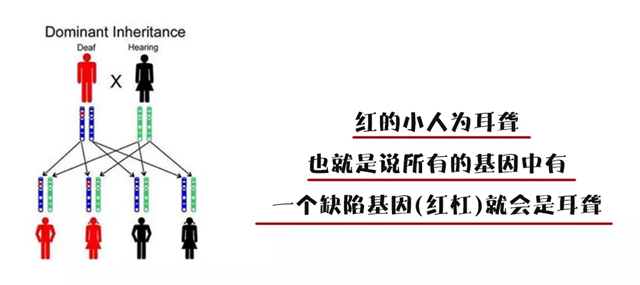 常染色体隐形遗传下去的比例是三比一,而常染色体显性,如果有一条链上一旦是有这个致病基因,那他就表现为致病。所以常染色体显性遗传,他的父母双方如果有一位是聋人,他的子女出现耳聋的可能性就是50%,红颜色的杠杠是代表有病的,也就是说患病的人群,然后他把这个红颜色的杠杠,遗传到下面两个,或者说他可以这样遗传,可能会生出四种人,其中50%是患病的。如果父母均是聋人,则子女出现耳聋可能性为75%,耳聋子女的下一代仍旧可能是聋人,不聋子女的下一代不会再出现聋人。
