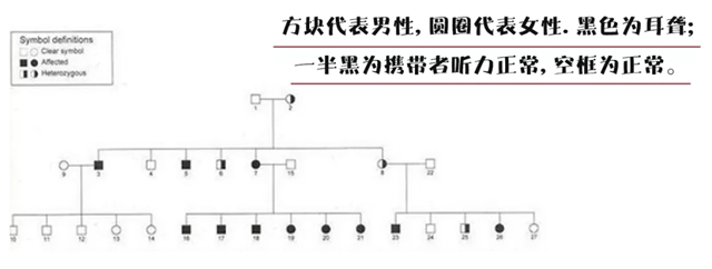 还有一个就是线粒体遗传,如下图中显示的家系图,这里小方块代表男性,小圆圈代表女性,线粒体遗传的特点为,母亲如果是携带者,孩子就有可能是患病的;母亲为患者,孩子都为患病;父亲为患者,孩子就不患病,所以它是母系遗传。也就是说,你如果是线粒体DNA基因突变的携带者,那你的妈妈一定是(携带者或者耳聋)。