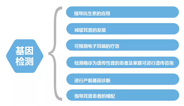 像有些基因突变是会影响听神经,如CHD7,IMM8A,PLVK等,这些影响听神经的基因如果发生突变,植入人工耳蜗的疗效其实是不好的。还有它可以评价再次生育子女出现耳聋的几率,就包括耳聋的患者或者家里有耳聋的病人,还可以进行产前的基因诊断,优生优育,对于有耳聋的患者夫妇意义特别重大,当他们生育了一个耳聋患儿之后很想生二胎,现在二胎的政策已经放开了,他们想生,但是不知道或者很害怕生出来第二个是否是耳聋产前基因诊断,可以预测基因是否有变化,避免聋儿的发生,还可以指导耳聋子女的婚配。