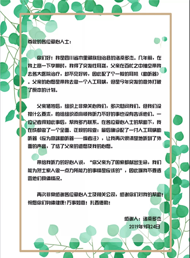 这是一封来自烈士儿子洛桑多杰的感谢信,而这位烈士就是在3·30木里县森林火灾中牺牲的杨达瓦,他生前一直有一个心愿,就是让他突发性耳聋的儿子戴上合适的助听设备,但因为火灾的发生,这个心愿一直未能达成。有一名热心的记者在偶然中得知此事后,在写杨瓦达的报道中,简单提及了洛桑多杰的事儿,结果引来众多社会上的爱心人士关注。其中包括来自成都的一家科技公司、公益机构、支教爱心人士,以及一位北京的耳蜗康复训练专家和一名上海的助听器调试专家,同时还包括来自省林草系统的人员,他们都自发表示深受英雄杨达瓦精神的感动,愿意出钱出力,默默帮助多杰解决听力障碍一事,弥补一下英雄的遗憾。
