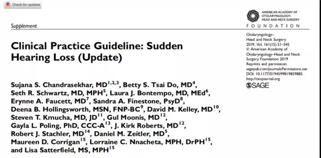 与美国耳鼻咽喉-头颈外科学会发表的临床实践指南进展手册第三版((Rosenfeld et al.Otolaryngol Head Neck Surg.2013;148[1]:S1-S55))相一致,指南更新小组由来自耳鼻喉科-头颈外科、耳科、耳神经学、家庭医学、听力学、急诊医学、神经内科、放射学、高级实践护理和消费者宣传等学科的代表组成。