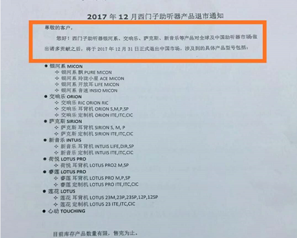 2017年12月31日,西万拓发布《西门子助听器产品退市通知》,宣布多款西门子助听器产品正式退出中国市场。