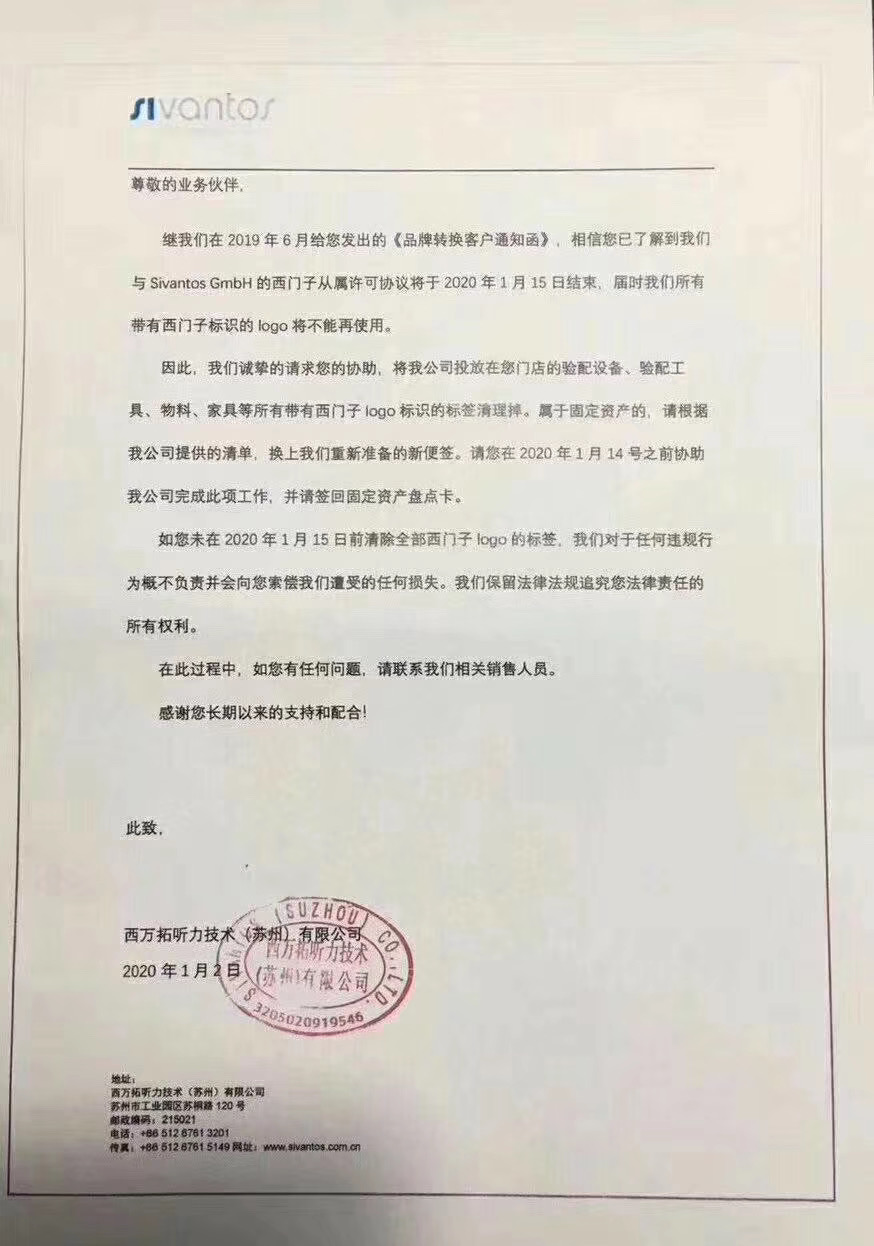 要求助听器门店在1月14日之前,将验配设备、验配工具、物料、家具等所有物品的西门子标识全部清理掉。