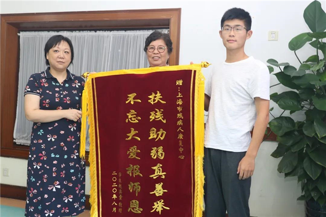 ▲赵奕量和家人为康复中心送来了一面锦旗