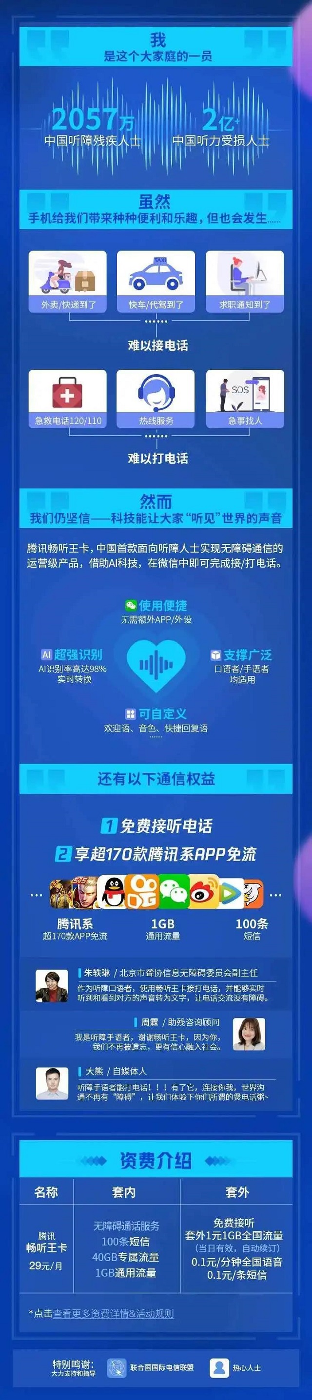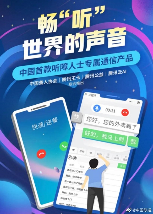 中国联通、腾讯王卡、腾讯公益、腾讯云AI联合中国聋人协会推出中国首款听障人士专属通信产品——畅听王卡。