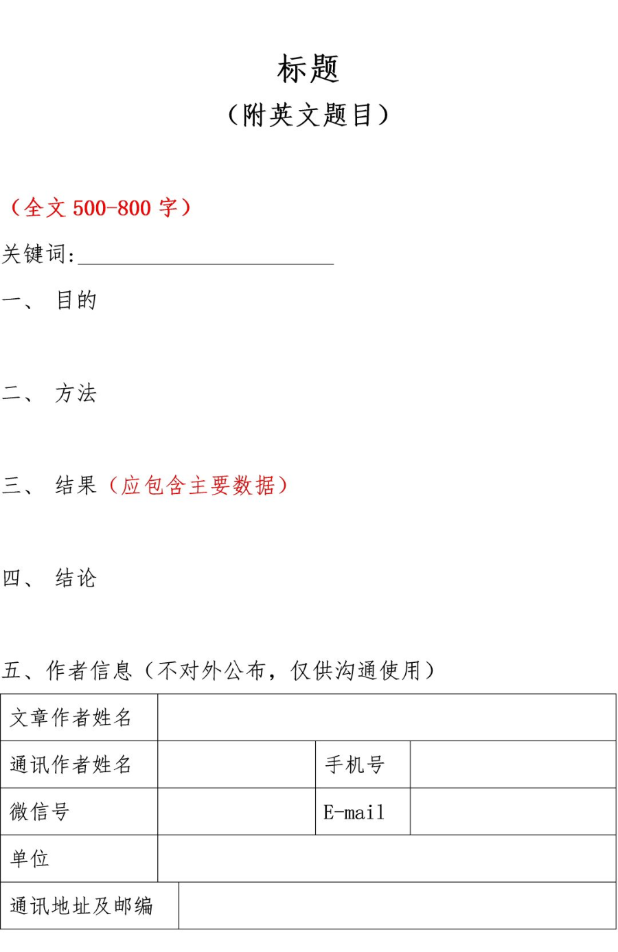 2.请按照附件中的格式撰写征文,并发送至会议专用邮箱。投稿形式为500~800字的中文摘要(请附上英文题目及关键词),按照目的、方法、结果、结论“四段式”撰写,结果中应包含主要数据。还需注明文章作者姓名、通讯作者姓名、单位、通讯地址、邮编、手机号、Email等信息,以便及时沟通。